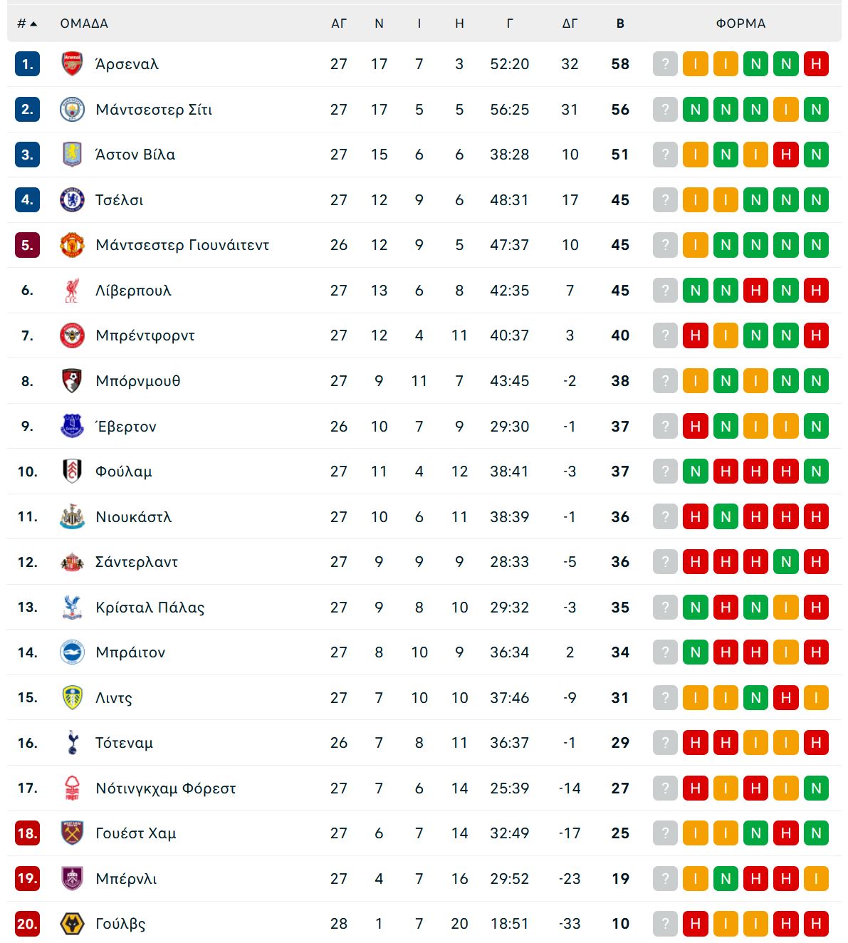 Αναλυτικά τα αποτελέσματα και το υπόλοιπο πρόγραμμα της 27ης της Premier League: