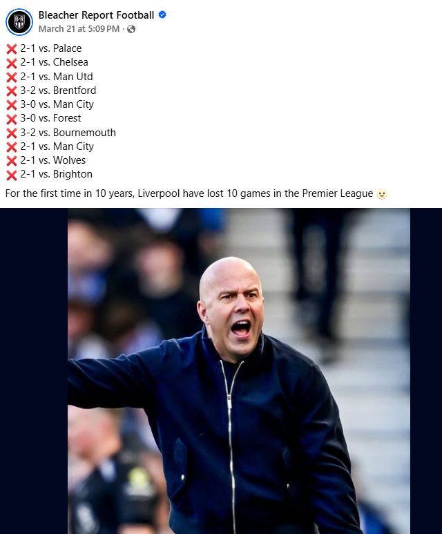Όσων αφορά την Premier League η Λίβερπουλ ξεκίνησε με φόρα, κάνοντας το 5/5 στις πρώτες αγωνιστικές, ωστόσο η συνέχεια δεν ήταν ανάλογη. Από την νίκη απέναντι στην συμπολίτισσα Έβερτον στα μέσα Σεπτέμβρη, η ομάδα δεν μπόρεσε να βρει ποτέ μια αγωνιστική σταθερότητα. Η μία ήττα διαδεχόταν την άλλη και έτσι οι «κόκκινοι» Απρίλη μήνα έχουν φτάσει στο σημείο να βρίσκονται στο -5 από την έξοδο στο Champions League. Απορίας άξιο το πως ομάδα με τέτοιο μπάτζετ έχει πραγματοποιήσει τέτοια κακή σεζόν, φτάνοντας τις δέκα ήττες. Κάτι ανάλογο έχει να συμβεί δέκα ολόκληρα χρόνια και συγκεκριμένα από τη σεζόν 2015-16, την πρώτη με τον Γιούργκεν Κλοπ στον πάγκο της ομάδας. Με επτά αγωνιστικές να απομένουν η Λίβερπουλ έχει την δυνατότητα να τις κάνει περισσότερες. Το μόνο κίνητρο πλέον στο πρωτάθλημα είναι το «κυνήγι» της τέταρτης θέσεις που θα την φέρει απευθείας στο League Phase της κορυφαίας διασυλλογικής διοργάνωσης την επόμενη σεζόν.