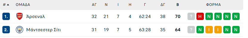 Τη δεδομένη στιγμή η Άρσεναλ είναι στο +38 με 62-24 τέρματα ενώ η Σίτι στο +35 με 63-28. Προς το παρόν υπερτερεί η ομάδα του Μικέλ Αρτέτα, αλλά αν η Σίτι κάνει τις δύο νίκες αυτές και την πιάσει στην πρώτη θέση, δεδομένα θα έχει πλέον και καλύτερο συντελεστή.