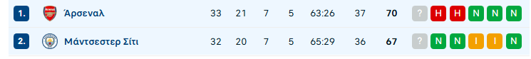 Η Σίτι νίκησε την Άρσεναλ με 2-1 και μείωσε τη διαφορά στο -3, έχοντας ένα ματς λιγότερο, ενώ πλέον έχει πάρει και την ισοβαθμία. Το πρόγραμμα των δύο μέχρι το φινάλε της Premier League.