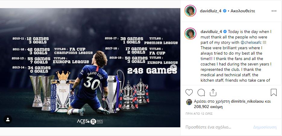 Ο Νταβίντ Λουίζ είναι πλέον παίκτης της Άρσεναλ ωστόσο δεν παρέλειψε να αποχαιρετήσει την Τσέλσι και να ευχαριστήσει άπαντες στην ομάδα για όσα έζησαν μαζί αυτά τα χρόνια.