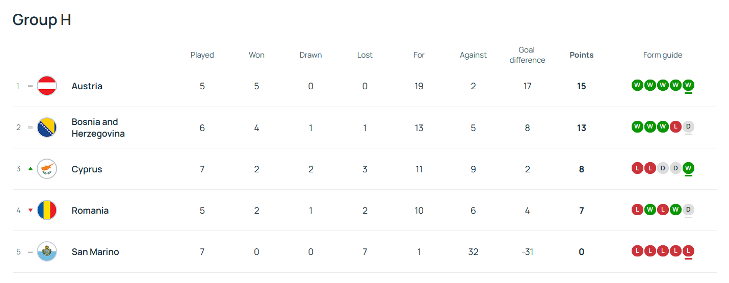 Εμφατική νίκη πήρε η Κύπρος απέναντι στο Σαν Μαρίνο, καθώς επικράτησε με 4-0, για τα προκριματικά του Παγκοσμίου Κυπέλλου. Με αυτό το τρίποντο, ανέβηκε στην 3η θέση με 8 βαθμούς, πίσω από Αυστρία και Βοσνία, που έχουν λιγότερα παιχνίδια και έχουν «κλειδώσει» τη δυάδα της κορυφής. Από την άλλη, οι γηπεδούχοι μετά από 7 αναμετρήσεις έχουν μείνει χωρίς βαθμό.