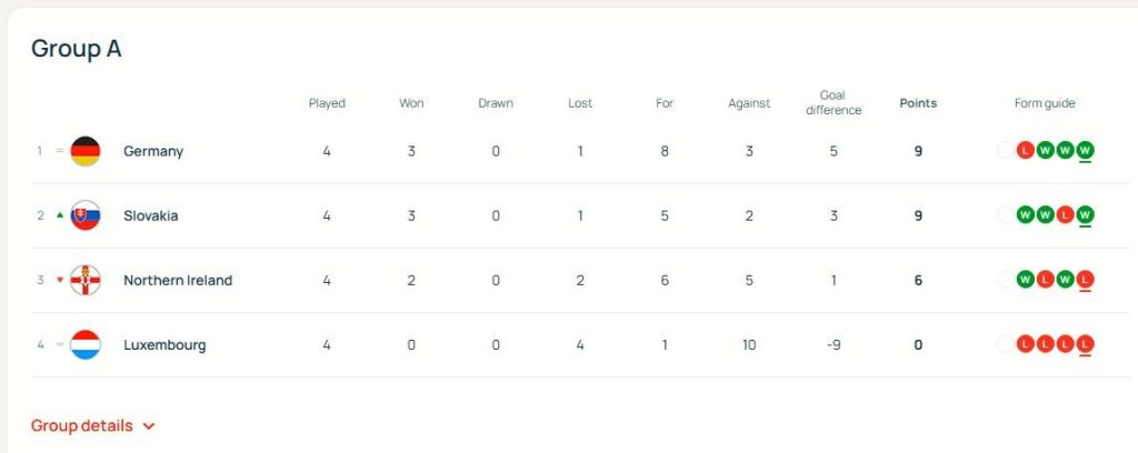 Η Γερμανία επικράτησε με 1-0 στην έδρας της Βόρειας Ιρλανδίας με γκολ του Βολτεμάντε στο 31ο λεπτό και ανέβηκε στην κορυφή του ομίλου της προσπερνώντας την Σλοβακία στην ισοβαθμία, έχοντας εννέα βαθμούς.