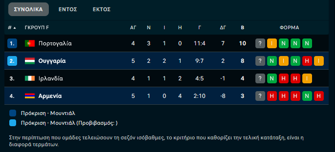 Στον έκτο όμιλο σπουδαία νίκη πήρε η Ουγγαρία με το 1-0 επί της Αρμενίας για την πέμπτη αγωνιστική. Ο Βάργκα στο 33′ από ασίστ του Σομπολσάι πέτυχε το μοναδικό γκολ του ματς και έφερε την ομάδα του σε θέση ισχύος όσον αφορά στη δεύτερη θέση πίσω από την Πορτογαλία.