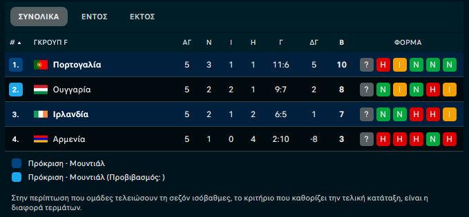 Παράταση στην απευθείας πρόκριση της Πορτογαλίας έδωσε η Ιρλανδία. Σε μία από τις πιο μεγάλες εκπλήξεις των προκριματικών η ομάδα του Χέιμιρ Χάλγκριμσον επικράτησε με 2-0 των Ιβήρων στο Δουβλίνο για την πέμπτη αγωνιστική στον πέμπτο όμιλο, έμεινε «ζωντανή» στο παιχνίδι της 2ης θέσης, ενώ από την πλευρά τους οι πρωτοπόροι του γκρουπ χρειάζονται νίκη εντός έδρας την Κυριακή (16/11) απέναντι στην ουραγό Αρμενία, έτσι ώστε να εξασφαλίσουν και μαθηματικά το «εισιτήριο» για τα γήπεδα των ΗΠΑ.