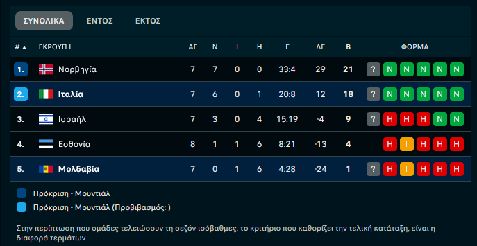 Στον ένατο όμιλο η Ιταλία νίκησε με 2-0 στην έδρα της Μολδαβίας, αλλά για να πάρει την πρώτη θέση στην τελευταία αγωνιστική θα πρέπει να νικήσει τη Νορβηγία με… εννιά γκολ διαφορά. Μαντσίνι στο 88′ και Εσπόζιτο στο 90+3′ πέτυχαν τα γκολ των φιλοξενούμενων.
