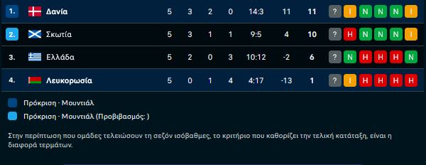 Αν η Δανία είχε νικήσει τη Λευκορωσία θα «κλείδωνε» την πρώτη θέση ακόμη και με ήττα στην τελευταία αγωνιστική, αρκεί να μην έχανε με πολλά γκολ διαφορά και έβγαζε καλύτερο συντελεστή τερμάτων η Σκωτία. Τώρα όμως έμπλεξε και ουσιαστικά πάει σε τελικό την προσεχή Τρίτη (18/11).