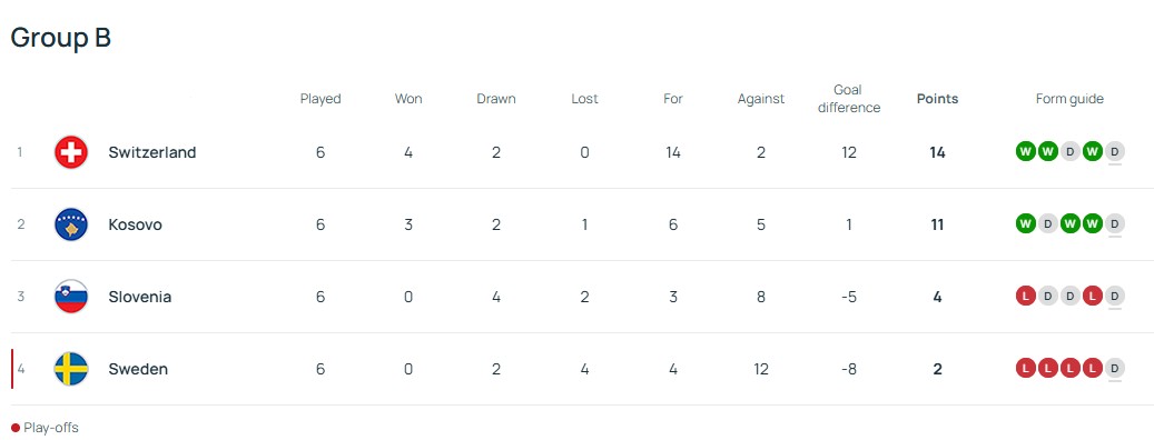 Απευθείας στο Μουντιάλ και η Ελβετία που έμεινε ισόπαλη 1-1 με το δεύτερο Κόσοβο. Οι «κόκκινοι» προηγήθηκαν με τον Βάργκας στο 47′, αλλά ο Μουσλίγια στο 74′ ισοφάρισε. Στο άλλο ματς, Σουηδία και Σλοβενία ήρθαν ισόπαλες 1-1, με τον Ελσνίκ στο 64′ να σκοράρει για τους φιλοξενούμενους, ενώ ο Λούντγκρεν έκανε το τελικό 1-1 στο 87′.