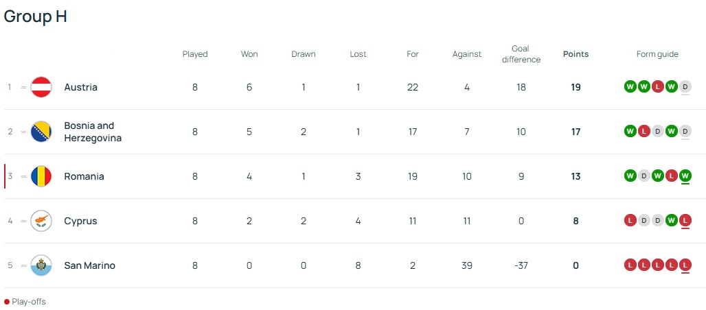 Οι φιλοξενούμενοι ήταν εκείνοι που προηγήθηκαν με δράστη τον Ταμπάκοβιτς στο 12′ και κρατούσαν εκείνοι την απευθείας πρόκριση, όμως ο Γκρέγκοριτς στο 77′ βρήκε δίχτυα, έκανε το 1-1 και έστειλε τη χώρα του κατευθείαν στη μεγάλη γιορτή του ποδοσφαίρου. Για τον ίδιο όμιλο, η Ρουμανία διέλυσε με 7-1 το Σαν Μαρίνο.