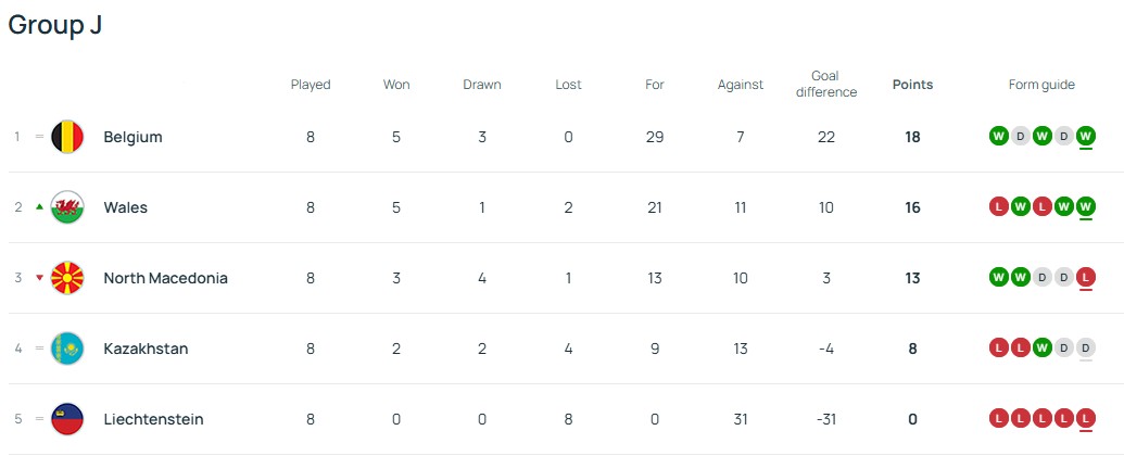 Τέλος, βροχή από γκολ στο Group J με το Βέλγιο να διαλύει με 7-0 το Λιχτενστάιν, ενώ η Ουαλία σκόρπισε με 7-1 τη Βόρεια Μακεδονία.
