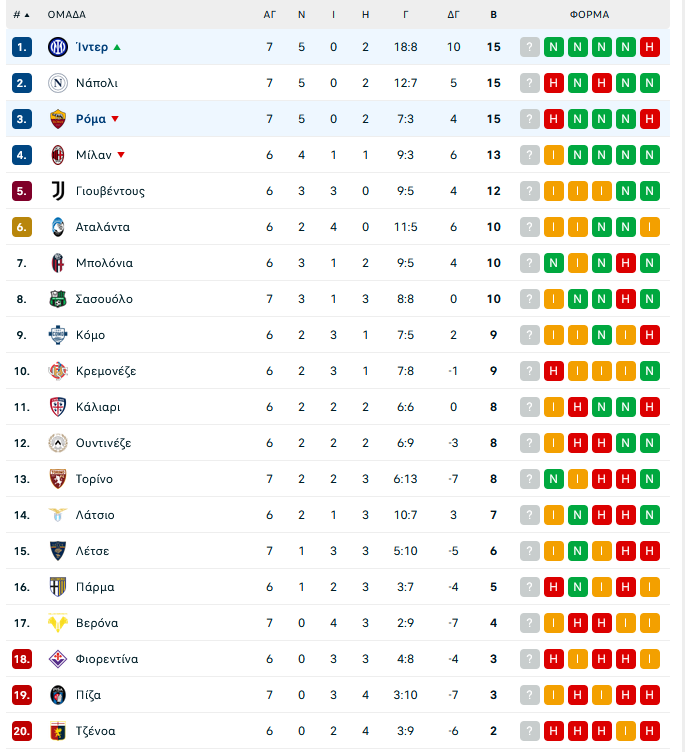 «Φωτιά» στην κορυφή της Serie A έβαλε η Ίντερ! Η ομάδα του Κριστιάν Κίβου πήρε το ντέρμπι του Ολίμπικο επικρατώντας με 1-0 της Ρόμα για την 7η αγωνιστική και την έπιασε στους 15 βαθμούς, όσους έχει και η Νάπολι που ηττήθηκε από την Τορίνο. Κάτι που σημαίνει πως αν αύριο η Μίλαν νικήσει τη Φιορεντίνα θα είναι μόνη πρώτη με 16 βαθμούς.