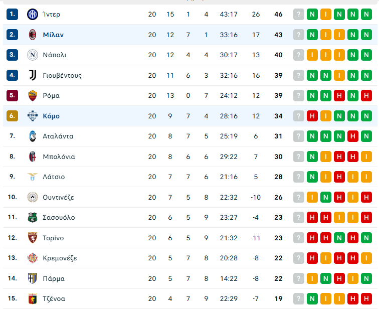 Η Μίλαν μπορεί να έμεινε πίσω στο σκορ από νωρίς στο ματς με την Κόμο, όμως έκανε την ανατροπή και παρέμεινε σε απόσταση αναπνοής από την πρώτη Ίντερ, μετά από 20 αγωνιστικές στη Serie A. Στους 43 βαθμούς και τη δεύτερη θέση, -3 από την κορυφή η ομάδα του Μασιμιλιάνο Αλέγκρι, στους 34 και την έκτη η ομάδα του Σεσκ Φάμπρεγκας.