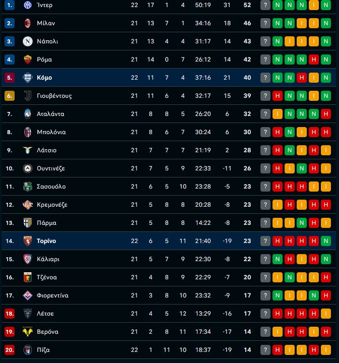 Από την άλλη, η Τορίνο φιγουράρει στην 14η θέση του βαθμολογικού πίνακα του ιταλικού πρωταθλήματος.