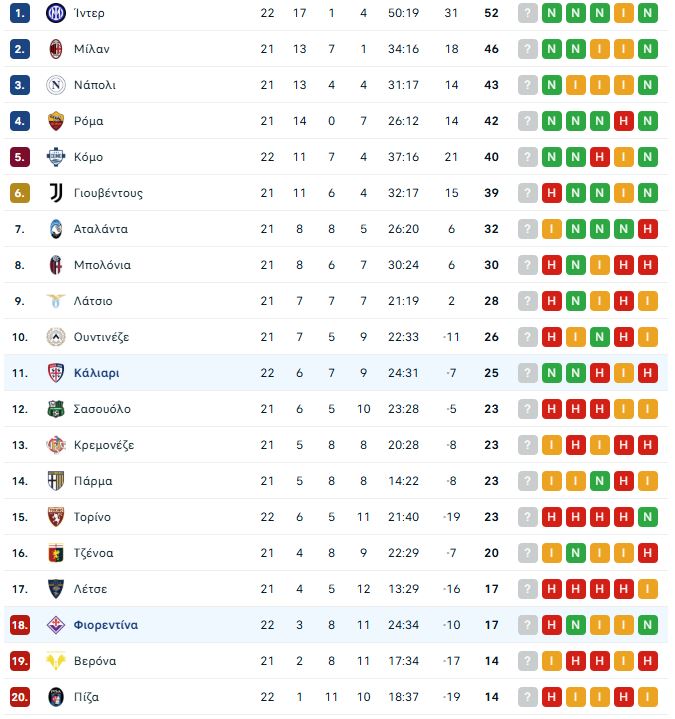 Αναλυτικά τα αποτελέσματα της 22ης αγωνιστικής της Serie A