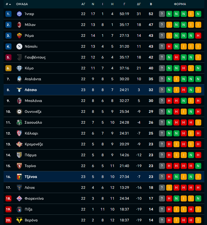 Με τους οπαδούς της να απέχουν από το γήπεδο διαμαρτυρόμενοι κατά της διοίκησης η Λάτσιο νίκησε με 3-2 την Τζένοα του Ντε Ρόσι στο «Ολίμπικο» για την 23η αγωνιστική της Serie A και συνεχίζει να ελπίζει – θεωρητικά – για Ευρώπη. Μετά από ένα πρώτο μέρος χωρίς γκολ και ιδιαίτερες συγκινήσεις, στο δεύτερο έγιναν τρία πέναλτι, μπήκαν πέντε γκολ και η ομάδα της Γένοβας υποχρεώθηκε στην πρώτη της ήττα στο νέο έτος μετά από πέντε παιχνίδια.