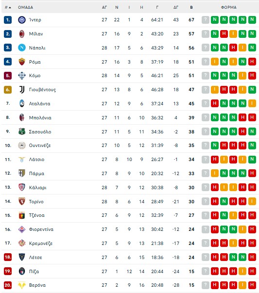Η βαθμολογία της Serie A