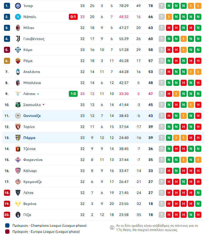 Αναλυτικά τα αποτελέσματα της 33ης αγωνιστικής στη Serie A