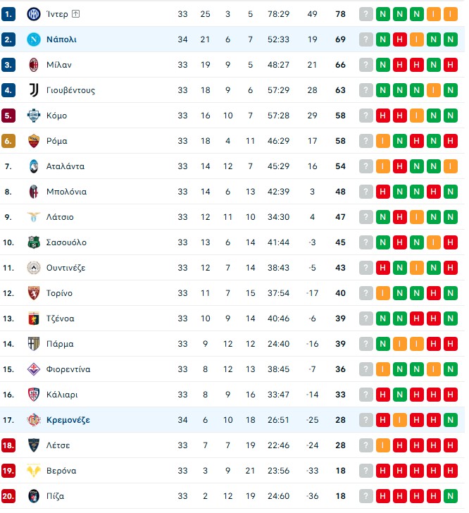 ΚΡΕΜΟΝΕΖΕ: Αουντέρο, Μπασιρότο, Μπονατσόλι, Φλοριάνι(46’ Τσέρμπιν), Λουπέρτο(61’ Φολίνο), Πετσέλα, Παγιέρο, Μποντό(46’ Γκράσι), Μαλέ(78’ Μπαρμπιέρι), Τερατσιάνο, Οκερέκε(46’ Φαντεπούτε)