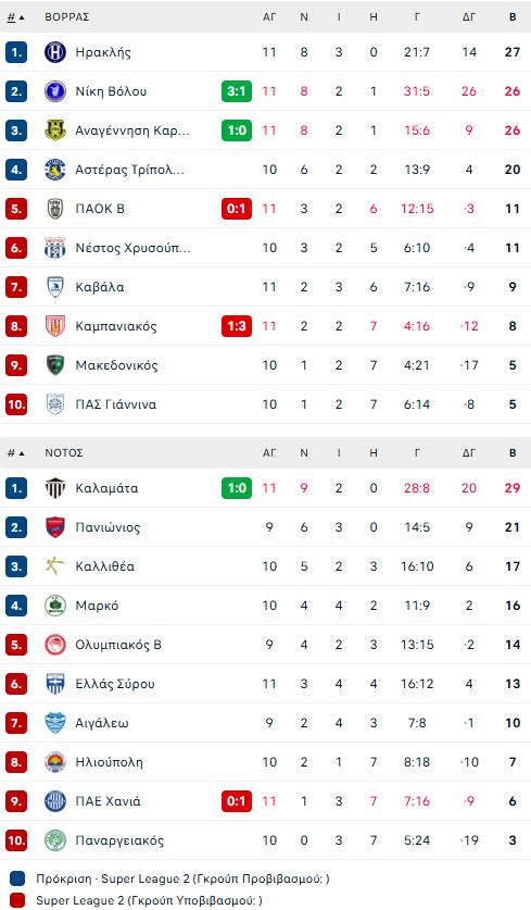 Οι βαθμολογίες των δύο ομίλων της Super League 2: