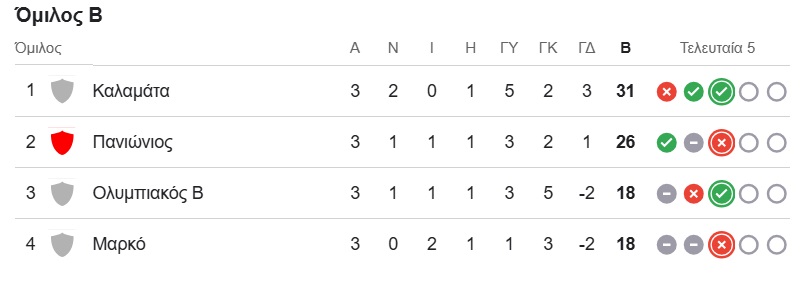 Με 5 βαθμoύς ξέφυγε πλέον στη μάχη της ανόδου η Καλαμάτα, μετά τη δική της νίκη με 2-0 επί της Μαρκό και την ήττα του Πανιωνίου με 1-2 από τον Ολυμπιακό Β΄ για την 3η αγωνιστική των πλέι οφ της Super League 2.
