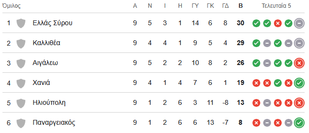 Μετά την αυτοκτονία του στο Άργος (οι ουραγοί δεν είχαν νίκη σε όλη τη σεζόν!), το Αιγάλεω παρέμεινε στους 26 βαθμούς, τη στιγμή που η ομάδα της Σύρου έφτασε τους 30 και είναι πρώτη, ενώ η Καλλιθέα έχει έναν λιγότερο, δηλαδή 29.