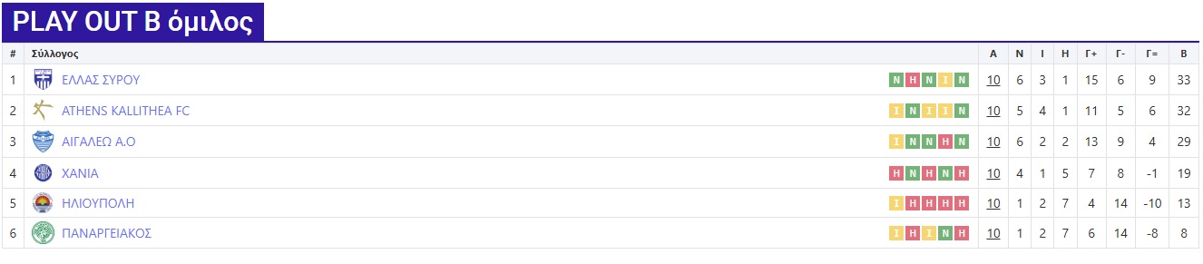 Ολοκληρώθηκαν οι 10 αγωνιστικές των πλέι άουτ του Β' ομίλου της Super League 2, με την Ελλάδα Σύρου να κατακτά την πρωτιά μετά τη νίκη της με 1-0 στο Άργος. Αναλυτικά η τελική βαθμολογία