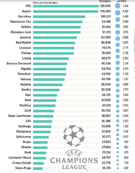 Και μπορεί η Μπάγερν να κατέκτησε το τρόπαιο, νικώντας 1-0 στον τελικό την Παρί Σεν Ζερμέν, όμως τα περισσότερα χρήματα μάζεψαν οι Παριζιάνοι (126.806.000 ευρώ), αφήνοντας δεύτερους τους Βαυαρούς (125.468.000 ευρώ) και τρίτη την Μπαρτσελόνα (100.251.000 ευρώ), όπως αναφέρει σχετικά η ισπανική εφημερίδα Marca, παρουσιάζοντας την έκθεση της UEFA.