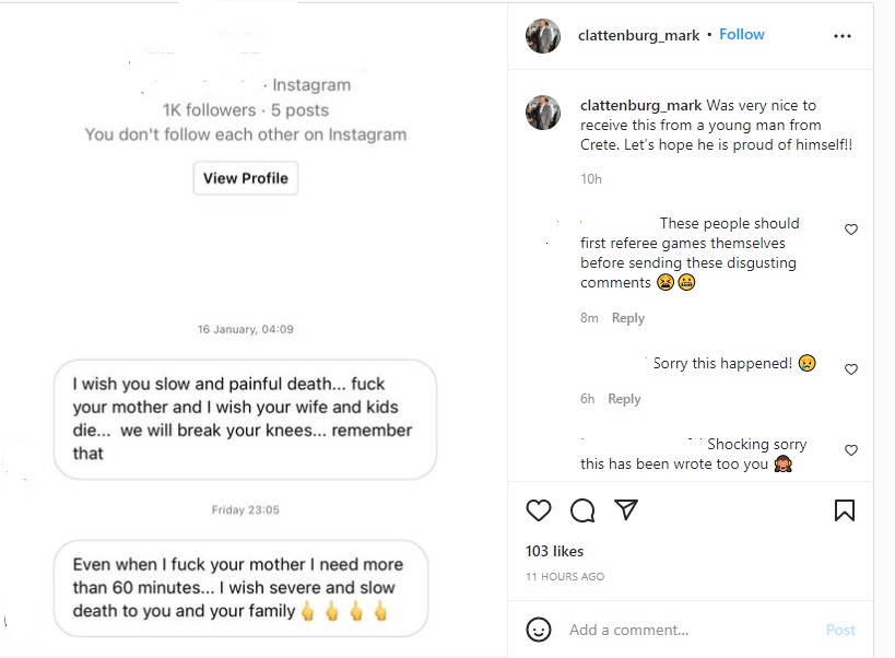 Ο Άγγλος αρχιδιαιτητής έλαβε σοκαριστικό μήνυμα που δεν δίστασε να το δημοσιεύσει, από κάποιον που του εύχεται αργό και βασανιστικό θάνατο στον ίδιο, στη γυναίκα του και στα παιδιά του. Ο Κλάτενμπεργκ το έθεσε σε κοινή θέα και σχολίασε μάλιστα στην ανάρτηση του με ειρωνικό τρόπο πως ελπίζει ο άγνωστος που έστειλε το συγκεκριμένο μήνυμα να είναι περήφανος για τον εαυτό του.