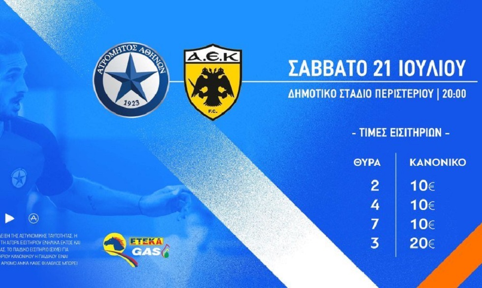 «Το Τμήμα Διαχείρισης Εισιτηρίων της ΠΑΕ Ατρόμητος ανακοινώνει ότι την Παρασκευή 20 Ιουλίου ξεκινά η προπώληση εισιτηρίων για τον φιλικό αγώνα με την ΑΕΚ που θα διεξαχθεί το Σάββατο 21 Ιουλίου στις 20.00 στο Δημοτικό Στάδιο Περιστερίου.