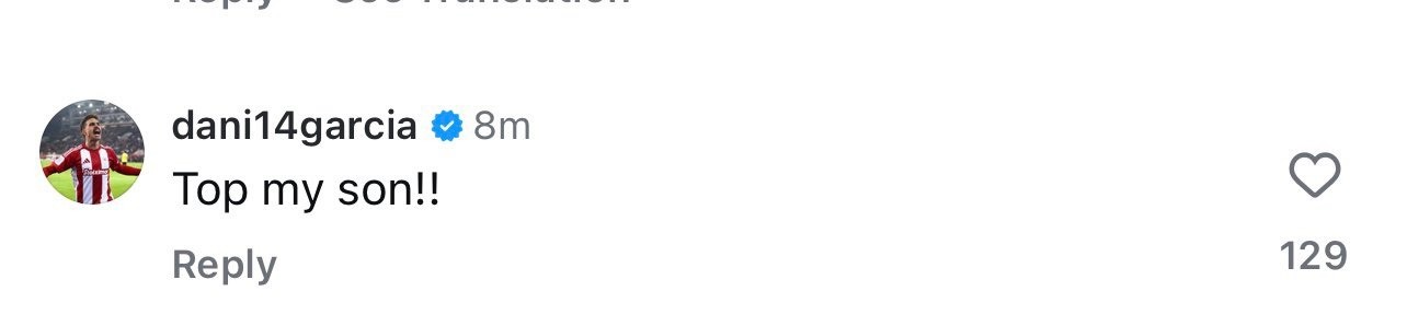Μόλις η είδηση πήρε επίσημη, ο συμπαίκτης του στον Ολυμπιακό, Ντάνι Γκαρθία, έκανε ένα επικό σχόλιο κάτω από ανάρτηση αναφέροντας σχετικά για τον Κωστούλα: «Κορυφαίο γιε μου»! Ο Ισπανός μέσος είναι 35 ετών, ενώ ο Μπάμπης μόλις έκλεισε τα 18 με τους δύο απ’ ότι φαίνεται να έχουν μια… ιδιαίτερη σχέση.