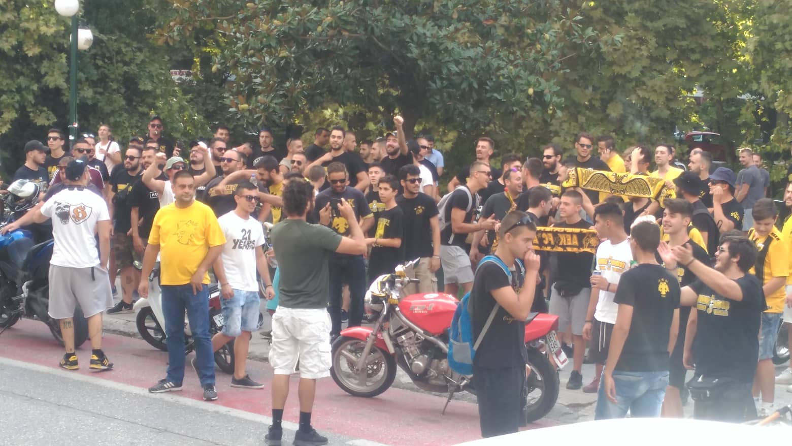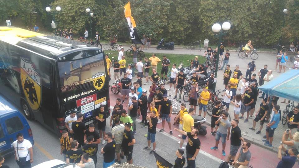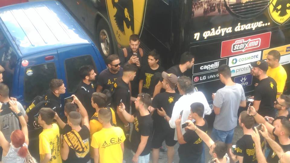 Περισσότεροι από 300 φίλαθλοι της ΑΕΚ πολιόρκησαν το ξενοδοχείο στο οποίο κατέλυσε η αποστολή της Πρωταθλήτριας Ελλάδος στο κέντρο της πόλης των Τρικάλων και στην συνέχεια συνόδεψαν το λεωφορείο στο γήπεδο όπου στις 20:00 θα διεξαχθεί το φιλικό με τον ΑΟ Τρίκαλα.