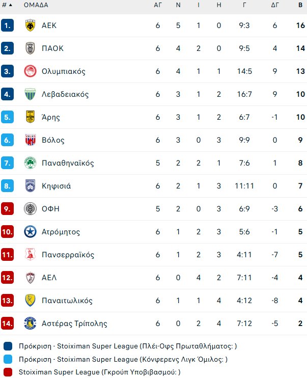 Η ΑΕΚ νωρίτερα νίκησε με ανατροπή 3-2 την Κηφισιά στο Περιστέρι και πλέον η «Ένωση» είναι πρώτη με 16 βαθμούς. Στη δεύτερη θέση ακολουθεί η ομάδα του Ραζβάν Λουτσέσκου με 14 πόντους, ενώ οι Πειραιώτες έπεσαν στην τρίτη με 13 βαθμούς.