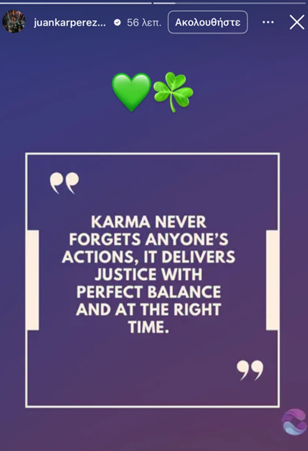 «Το κάρμα ποτέ δεν ξεχνά τις πράξεις του καθενός και αποδίδει δικαιοσύνη με τέλεια ισορροπία και την κατάλληλη στιγμή», αναφέρει στο story του ο Ισπανός ποδοσφαιριστής.