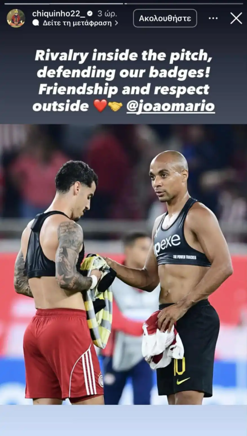 «Αντιπαλότητα μέσα στο γήπεδο, υπεράσπιση των εμβλημάτων μας! Φιλία και σεβασμός έξω από αυτό», έγραψε χαρακτηριστικά ο Τσικίνιο.