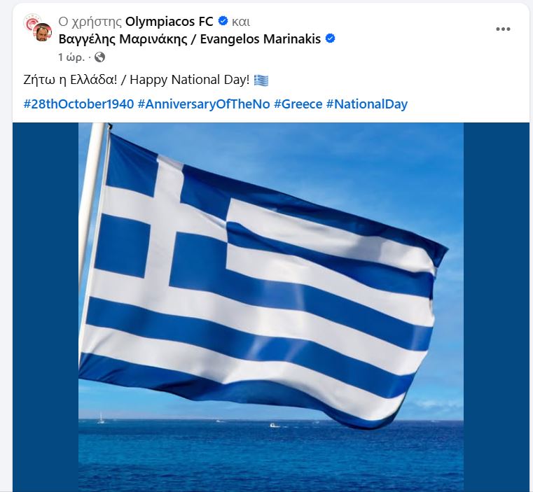 Σπουδαία μέρα η σημερινή για την Ελλάδα, που γιορτάζει την Επέτειο του Όχι. Με αφορμή, λοιπόν, τους εορτασμούς για την 28η Οκτωβρίου, η ΠΑΕ Ολυμπιακός και ο διοικητικός ηγέτης της, Βαγγέλης Μαρινάκης έκαναν μία ανάρτηση θέλοντας να στείλουν το δικό τους μήνυμα.
