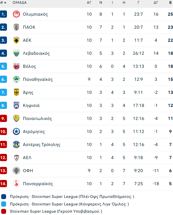 Ολοκληρώθηκε η 10η αγωνιστική της Super League, με τον Ολυμπιακό να απολαμβάνει πλέον την μοναξιά της κορυφής.