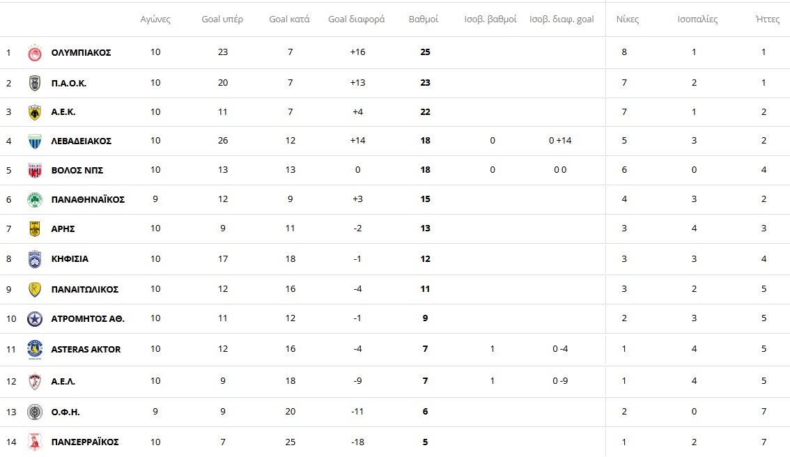 Η βαθμολογία της φετινής σεζόν της Super League σε 10 αγωνιστικές