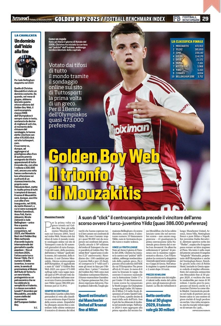 «Για πρώτη φορά, ένας Έλληνας παίκτης θριάμβευσε στο βραβείο Golden Boy Web. Ψήφοι οπαδών από όλο τον κόσμο μαζεύονται σε μια διαδικτυακή ψηφοφορία στην ιστοσελίδα. Έτσι, ο Χρήστος Μουζακίτης, ο 18χρονος μέσος του Ολυμπιακού, κέρδισε το βραβείο Golden Boy Web 2025 με το πάτημα ενός κουμπιού, με σχεδόν 473.000 ψήφους στους διάφορους μηνιαίους γύρους (ίσο με το 39% όλων των ψήφων), ξεπερνώντας τον περσινό νικητή, τον Τούρκο παίκτη της Γιουβέντους Κενάν Γιλντίζ (σχεδόν 386.000 ψήφους, ίσο με 31,8%).