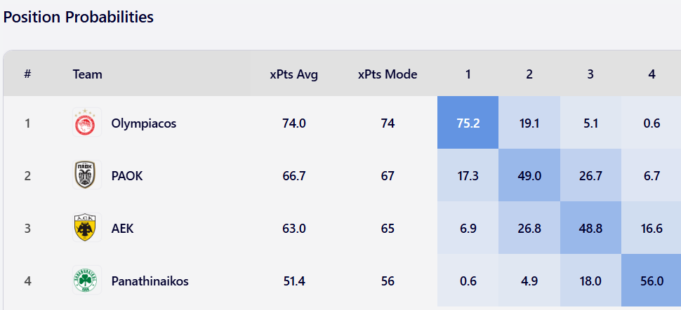 O Ολυμπιακός παραμένει πρώτο φαβορί για τον τίτλο, με 75,2% πιθανότητες, ενώ οι προσομοιώσεις του Football Meets Data προβλέπουν πως θα έχει 74 βαθμούς στο τέλος της διαδρομής.