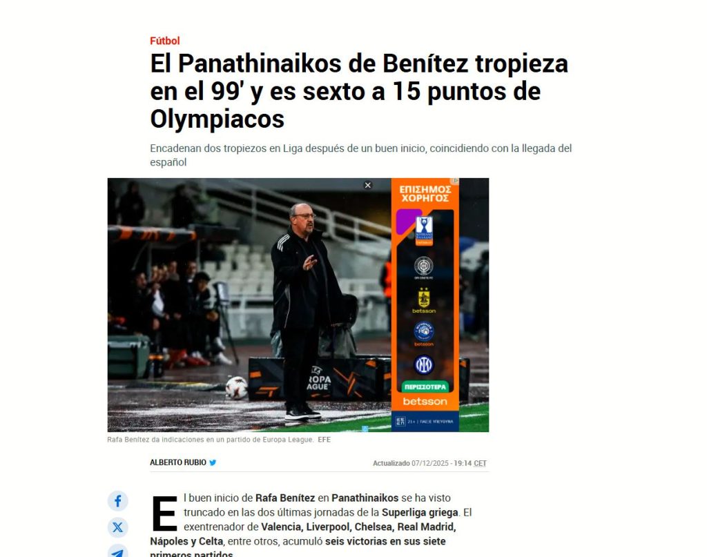 Η ισπανική ιστοσελίδα αναφέρθηκε στη νέα γκέλα του Παναθηναϊκού, με την ομάδα του Ράφα Μπενίτεθ να μένει στο -15 από τον Ολυμπιακό.