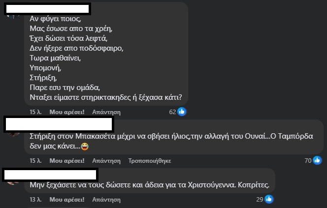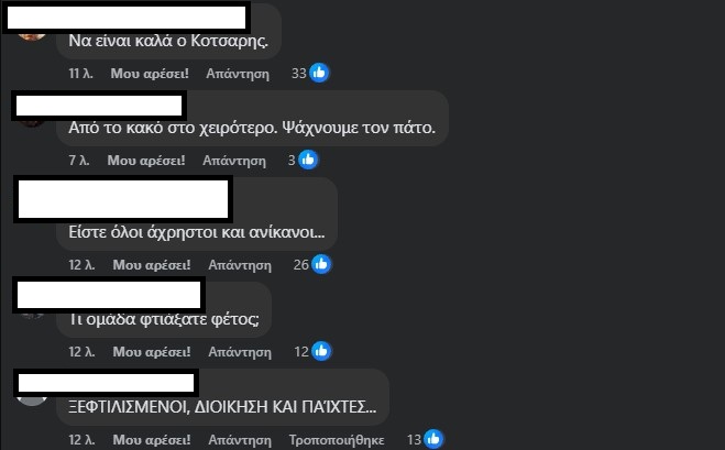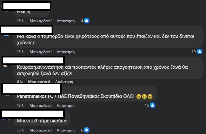 «Αξιολύπητη όλη η ομάδα», «Πάλι καλά που ήταν ο Κότσαρης σήμερα», «Είστε όλοι ανίκανοι», «Τραγικοί παίκτες, τραγικός προπονητής», «Αλαφούζο πούλα», είναι μερικά από τα σχόλια των οπαδών του Παναθηναϊκού.
