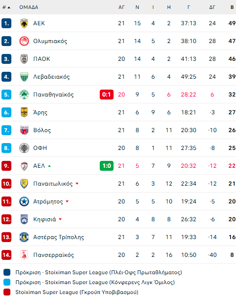 Σε συνδυασμό με το χθεσινό (14/2) 0-0 του Ολυμπιακό με τον Λεβαδειακό, η βαθμολογία πλέον διαμορφώνεται ως εξής: ΑΕΚ 49 βαθμοί, Ολυμπιακός 47 και ΠΑΟΚ 46 πόντοι, με τον «Δικέφαλο του Βορρά» να έχει ένα ματς λιγότερο: Αυτό με την Κηφισιά εκτός έδρας που θα το παίξει τον ερχόμενο Μάρτιο.