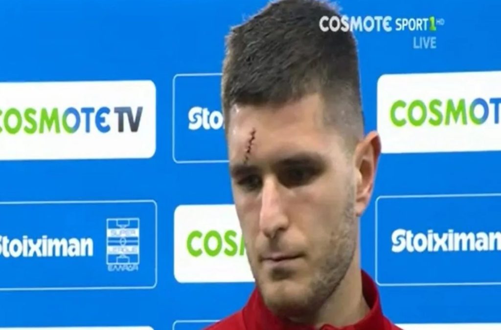 Μετά το τέλος του αγώνα στο Καραϊσκάκη, ο κεντρικός αμυντικός των «ερυθρόλευκων» στάθηκε μπροστά στην κάμερα της Cosmote TV για τις καθιερωμένες δηλώσεις και το έκανε έχοντας βγάλει τον επίδεσμο στο κεφάλι του, Έτσι, ήταν κάτι παραπάνω από εμφανές και το μέγεθος του χτυπήματος που δέχθηκε.