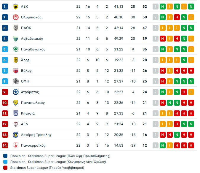 Η ΑΕΚ διέλυσε με 4-0 τον Λεβαδειακό για την 22η αγωνιστική της Super League και ανέβηκε και πάλι στην κορυφή, ο Ολυμπιακός νίκησε με 2-0 τον Παναιτωλικό και βρίσκεται στο -2 από την Ένωση, ενώ ο ΠΑΟΚ απώλεσε δύο βαθμούς απέναντι στην ΑΕΛ Novibet. Το πρόγραμμα των τριών μέχρι το τέλος της κανονικής περιόδου.