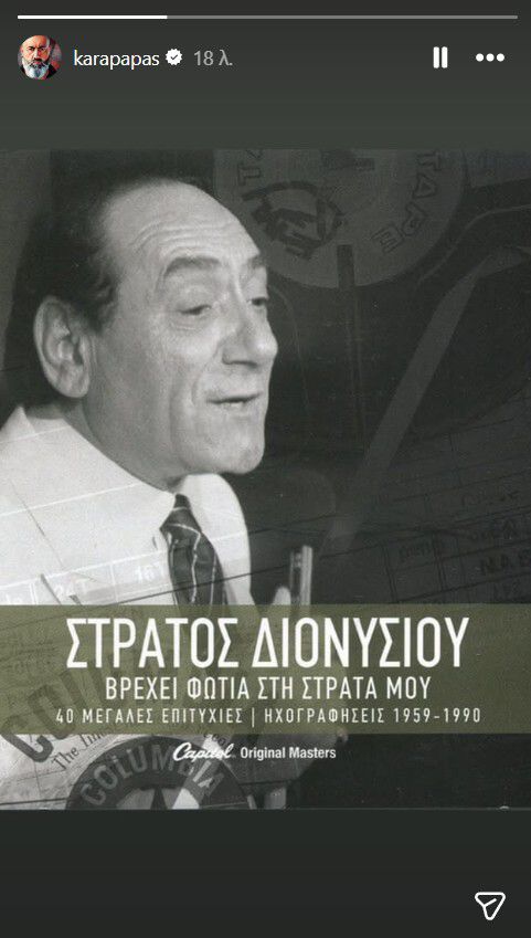 Ο αντιπρόεδρος της ΠΑΕ Ολυμπιακός, προχώρησε σε ανάρτηση στον προσωπικό του λογαριασμό στο Instagram, δημοσιεύοντας ένα story στο οποίο εμφανιζόταν ο Στράτος Διονυσίου, συνοδευόμενο από το γνωστό τραγούδι «Βρέχει φωτιά στη στράτα μου».