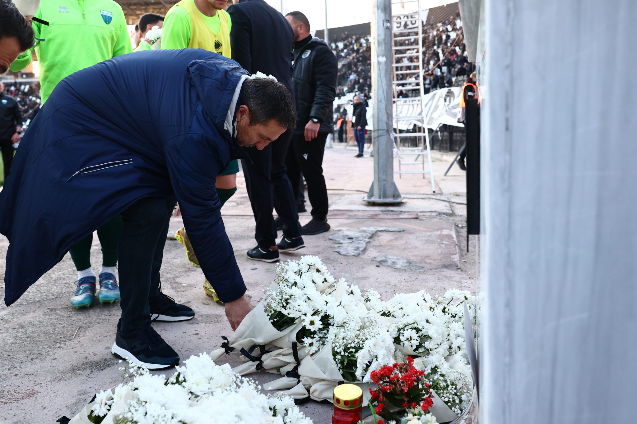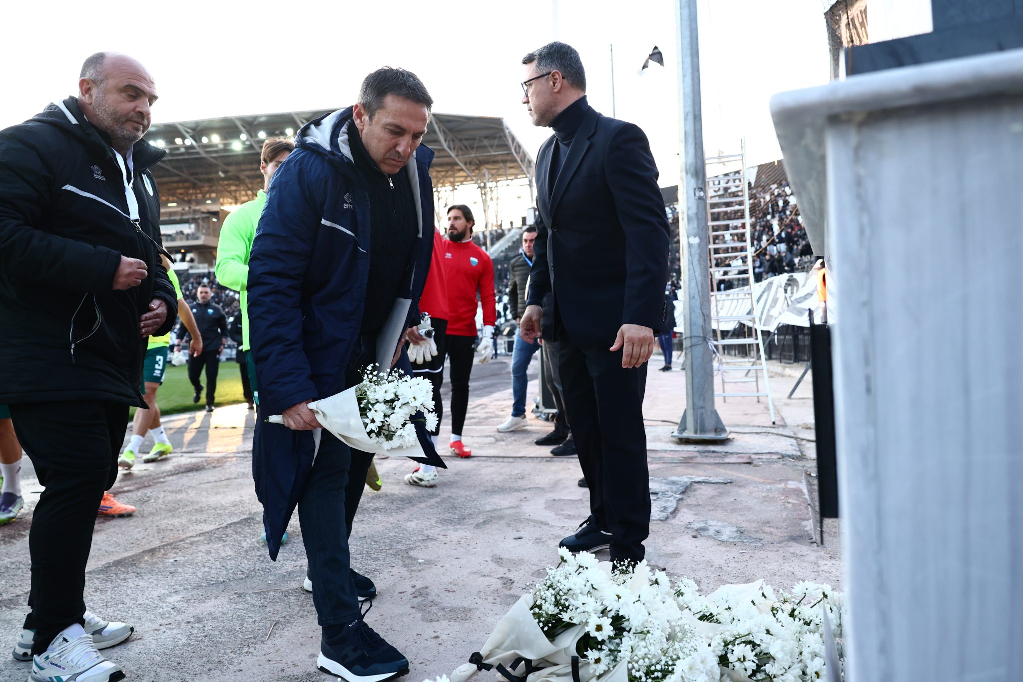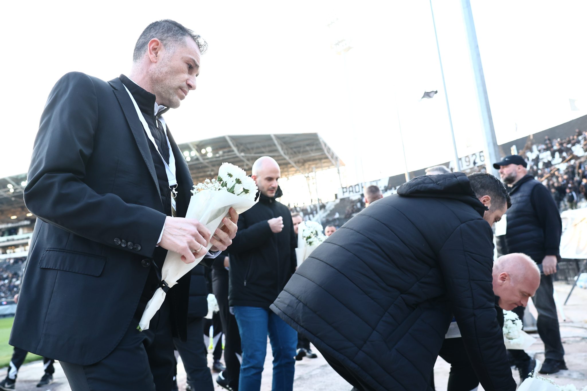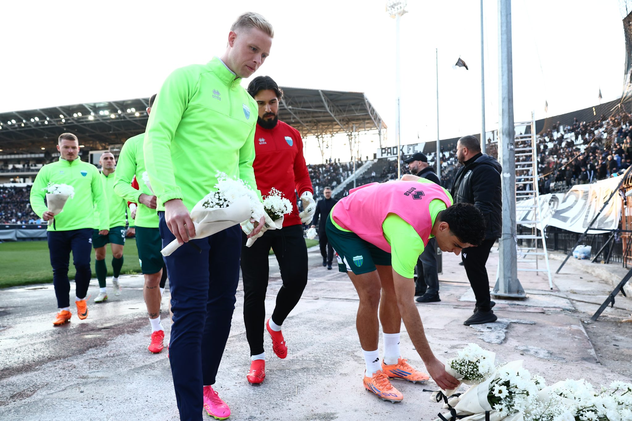 Συγκινητικές στιγμές στην Τούμπα, αφού πριν τη σέντρα του αγώνα του ΠΑΟΚ -Λεβαδειακός οι παίκτες των δύο ομάδων κατέθεσαν λουλούδια στη μνήμη του 20χρονου οπαδού του Δικεφάλου που δολοφονήθηκε στην Καλαμαριά.