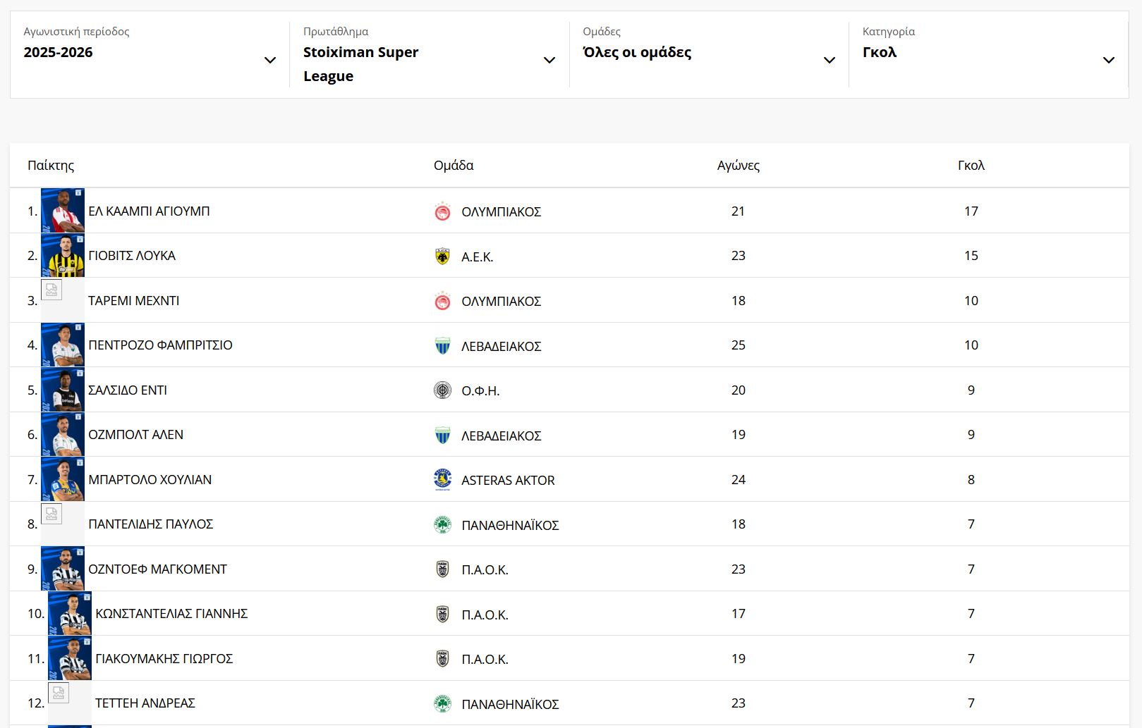 Φουντώνει η μάχη για τον πρώτο σκόρερ της Super League 2025-26, με τον Αγιούμπ Ελ Κααμπί να έχει το προβάδισμα φτάνοντας τα 17 γκολ το Σάββατο κόντρα στον ΟΦΗ και τον Λούκα Γιόβιτς να «απαντά» την Κυριακή (15/3) με δύο δικά του για τα 15 συνολικά.