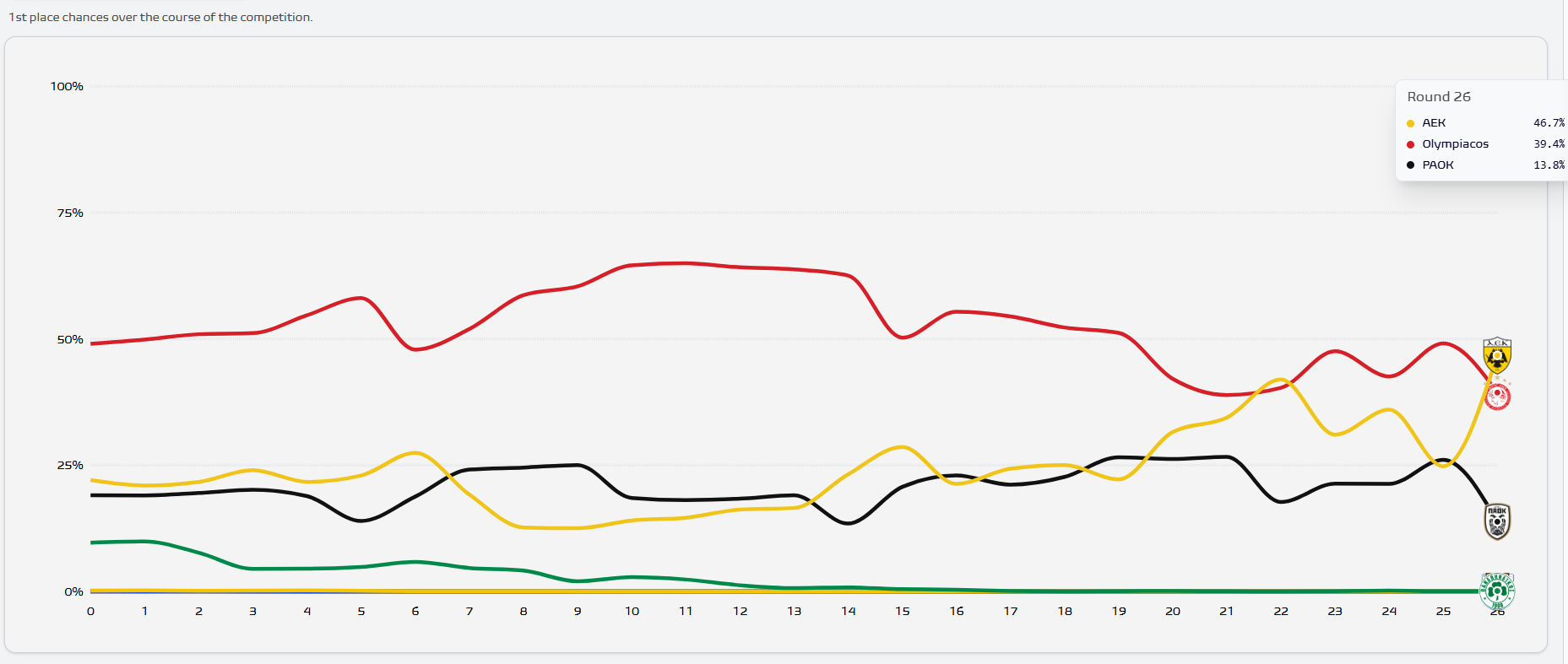 Κάπως έτσι, με τα αποτελέσματα της τελευταίας αγωνιστικής διαμορφώθηκε εκτός από τη βαθμολογία και οι πιθανότητες κατάκτησης της Superleague, με to10.gr να καταγράφει τα δεδομένα με τη βοήθεια του Football Meets Data.