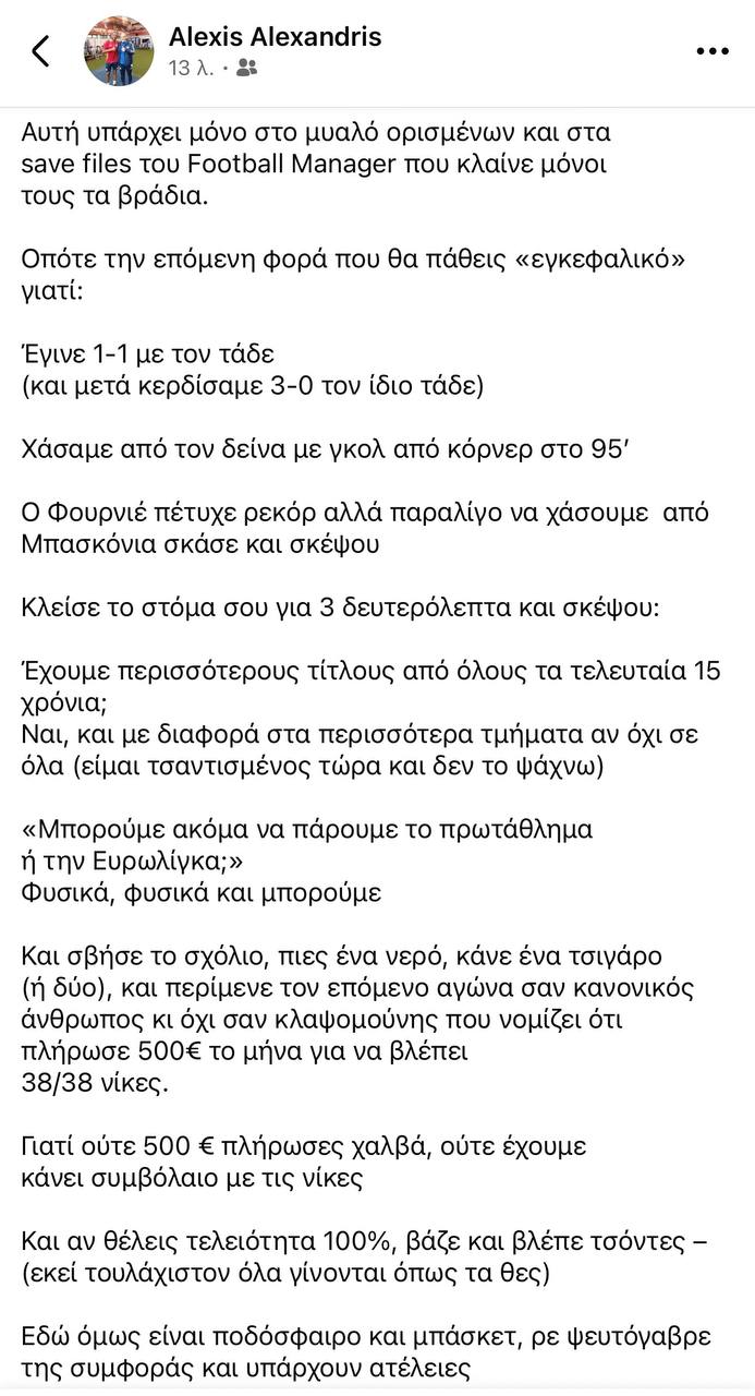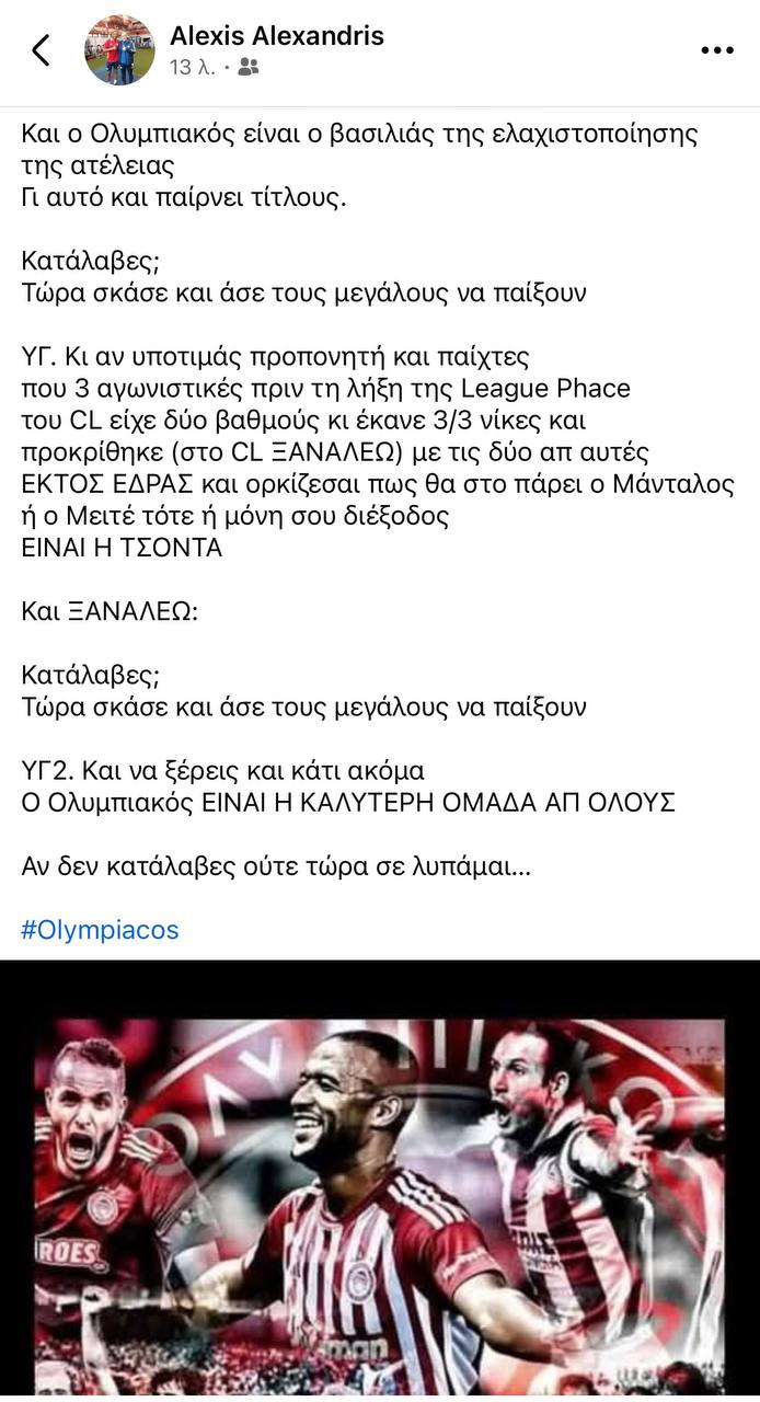 Ο Αλέκος Αλεξανδρής έστειλε το δικό του μήνυμα με ανάρτησή του στα social media, με αφορμή την ισοπαλία του Ολυμπιακού, με την ΑΕΛ Novibet (0-0), την 26η και τελευταία αγωνιστική της κανονικής περιόδου της Superleague.