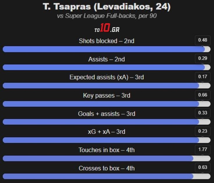 Στη Super League, συγκριτικά με όλα τα πλάγια μπακ του πρωταθλήματος, είναι δεύτερος σε μπλοκαρισμένα σουτ ανά 90 λεπτά (0,48), όπως και σε ασίστ (0,29), ενώ είναι τρίτος σε xAssist (0.17) και key passes (0.66), σύμφωνα με τα δεδομένα του DataMB. Επίσης, ακόμη ένα σημαντικό στοιχείο και κάτι που οι ομάδες προσέχουν στα πλάγια μπακ, είναι τα πατήματα στην μεγάλη περιοχή και συγκεκριμένα οι ενέργειες με τη μπάλα σε αυτή. Ο Τσάπρας είναι το τρίτο μπακ με τις περισσότερες (1,77) σε όλη τη Super League.